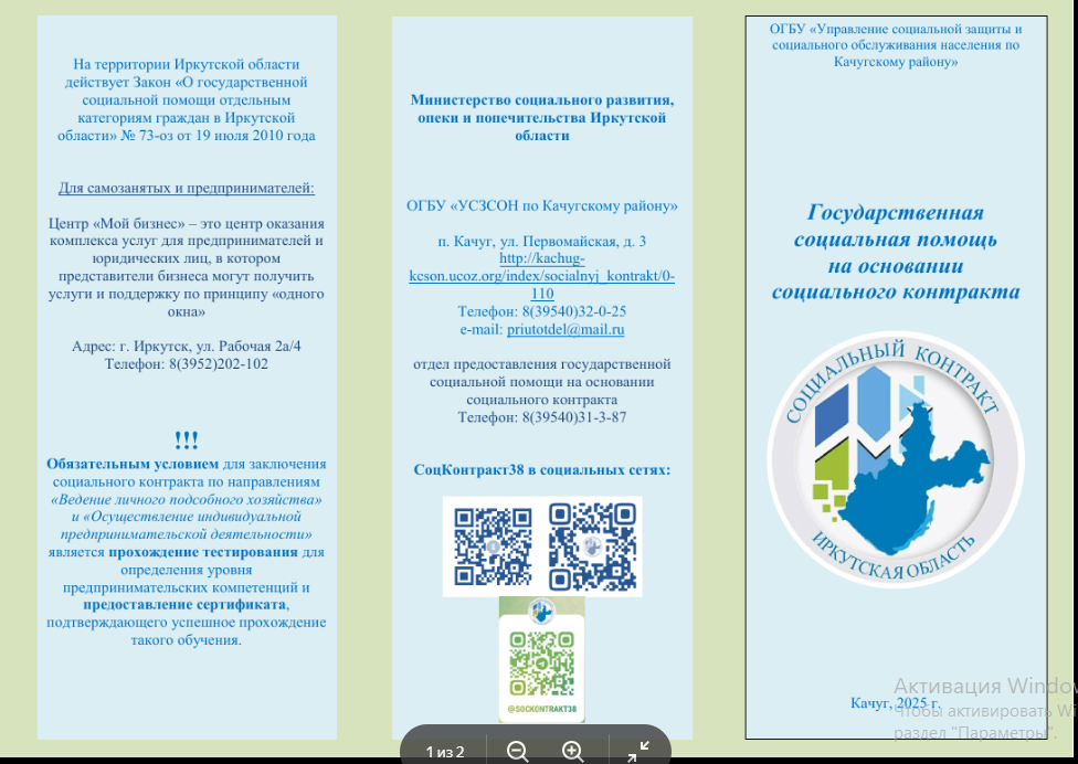 ОГБУ «Управление социальной защиты и социального обслуживания населения по Качугскому муниципальному округу» продолжает прием заявлений и документов на оказание государственной социальной помощи на основании социального контракта по направлениям «Ведение личного подсобного хозяйства», «Осуществление индивидуальной предпринимательской деятельности», «Поиск работы» в соответствии с Законом Иркутской области от 19 июля 2010 года №73-ОЗ «О государственной социальной помощи отдельным категориям граждан в Иркутской области». Информацию по условиям и порядку предоставления государственной социальной помощи на основании социального контракта можно получить по телефону: отдел предоставления государственной социальной помощи на основании социального контракта – 8(39540)31-3-87 или обратившись лично в Управление по адресу: п. Качуг, ул. Ленских Событий, д. 26, каб. 11. |