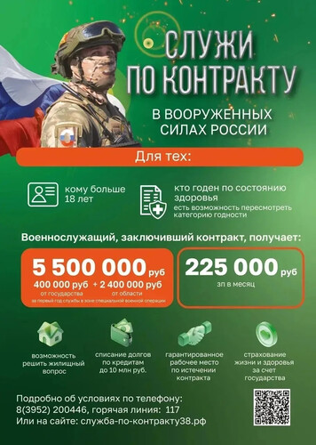 Военнослужащие, заключившие контракт с 1 января 2026 года, получат: 🔹 Региональную единовременную выплату — 2 400 000 рублей ➕ К этому — зарплата по занимаемой должности и полный пакет социальных гарантий для военнослужащих и их семей, предусмотренный законом. 💰 Общий доход за первый год службы — более 5 миллионов рублей! --- 📌 Подробности — по телефону 117 📞 Контактное лицо: Ирина Романовна — 8 (908) 779-47-14 #СлужбаПоКонтракту #Качуг #ПоддержкаГероям #АрмияРоссии #КачугскийОкруг |